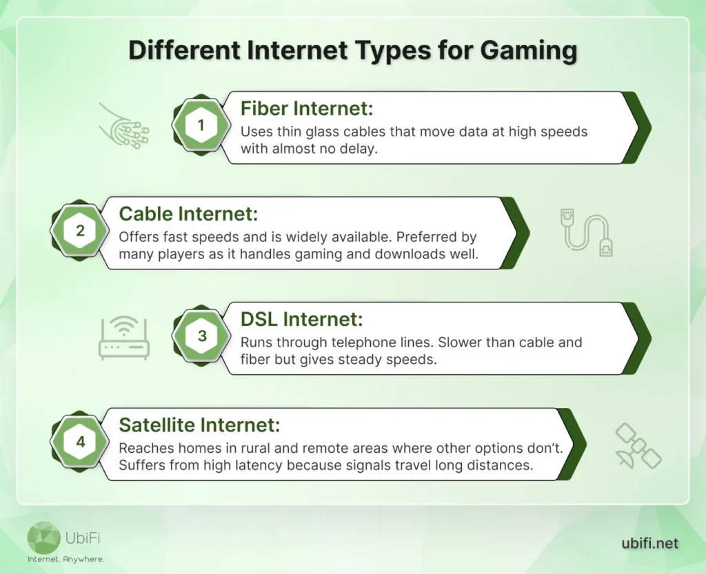 4. Fiber offers the best performance for competitive or high-demand gaming, while cable, DSL, and satellite can work for casual play but may face speed or latency limitations.